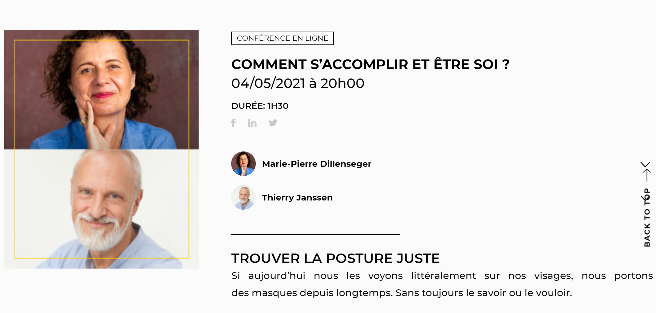 may, 2021 S'accomplir et Etre soi - MP Dillenseger et T. Janssen 04may8:00 pm9:30 pmS'accomplir et Etre soi - MP Dillenseger et T. JanssenWebinaire BloomingYou Event Details Event Details Time (Tuesday) 8:00 pm - 9:30 pm CEST LocationVisioconference Organizer Amal Dadolle BloomingYou CalendarGoogleCal